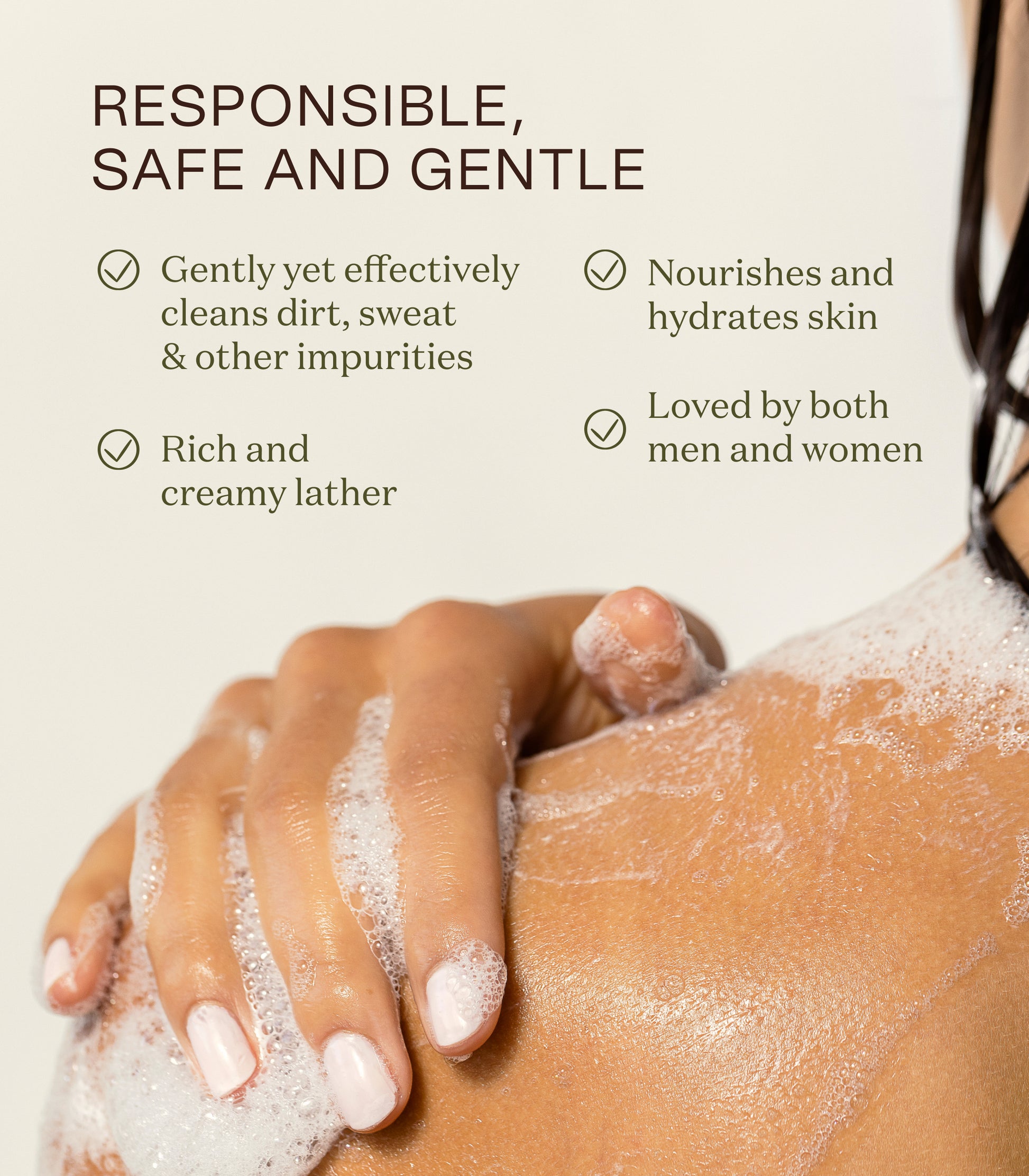 Most natural body washes still use sulfates or rely on betaines, synthetic fragrances, and harsh preservatives that can strip your skin and disrupt its natural barrier.